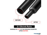 3:1 heat shrink tubing will slide easily over inline splices and connectors, and shrink down to 33% of its original diameter to fit snugly over any wire, hose or cable management project. it is an excellent way to terminate the ends of your Braided Sleeving, creating a tight, professional finish.