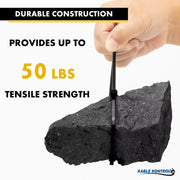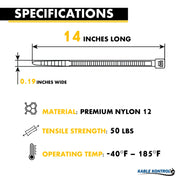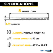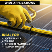 Kable Kontrol Nylon 12 Solar Cable Ties are designed with premium Polyamide 12 (Nylon 12). Solar Zip Ties are specifically engineered for superior durability and long-lasting performance in outdoor and solar applications. With built-in UV inhibitors and carbon black, our solar panel zip ties offer up to years of UV resistance, ensuring they withstand harsh sun exposure without degradation. Highly resistant to salt damage, chemicals, and impact, these ties are perfect for demanding environments such as solar panel installations. They feature an operating temperature range from -40°C to +85°C and can handle short-term exposure up to +110°C, maintaining their strength and stability. With low moisture absorption (<1.0%) and resistance to stress cracking, these solar panel ties ensure reliable performance even in fluctuating weather conditions. The smooth edges eliminate abrasion damage, protecting cables and surfaces during installation. Ideal for galvanized steel contact, they provide secure fastening without causing corrosion or harm. The standard PA12 cable ties are over 3600 hours of UV exposure continually in a UV chamber. The UV strength is equivalent to about 24 years of weather resistance. Designed to excel in solar energy systems, these heavy-duty solar ties are chemically resistant and have a low density, offering enhanced stability, flexibility, and a long lifespan for outdoor use in extreme weather conditions.